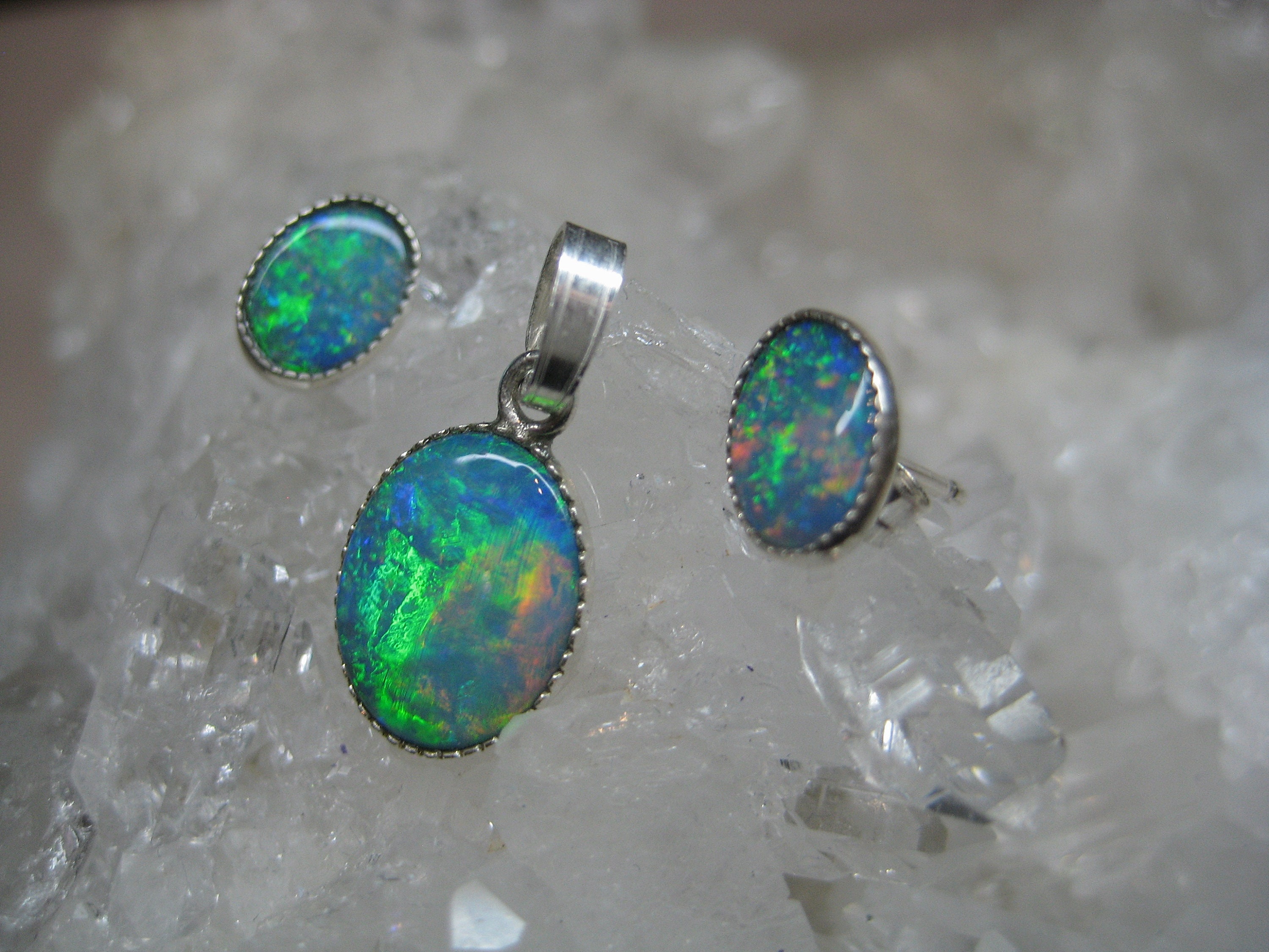 Crystal Opal jewelry set 925 silver, very nice oval opal stud earrings in blue and a nice oval opal pendant. These natural opals from Coober Pedy (Australia) have a great brilliant play of colors in several colors. The genuine Opale from Australia are very popular. A great gift for women who love special jewelry.